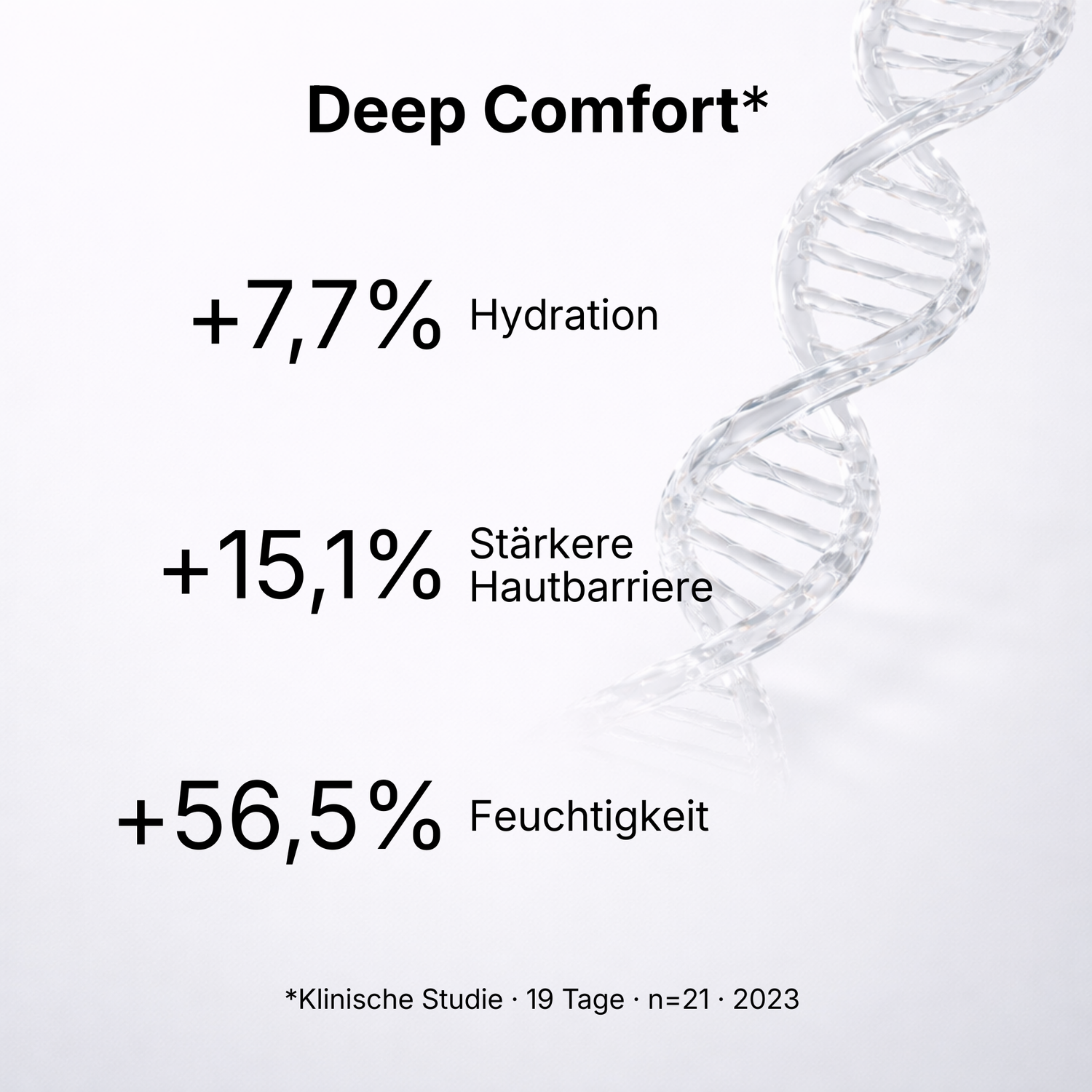 Klinische Testergebnisse zeigen, dass sich die Hautfeuchtigkeit um +7,7 % verbessert, während die Hautbarriere um +15,1 % gestärkt wird. Zusätzlich steigt die Hautfeuchtigkeit insgesamt um +56,5 %.