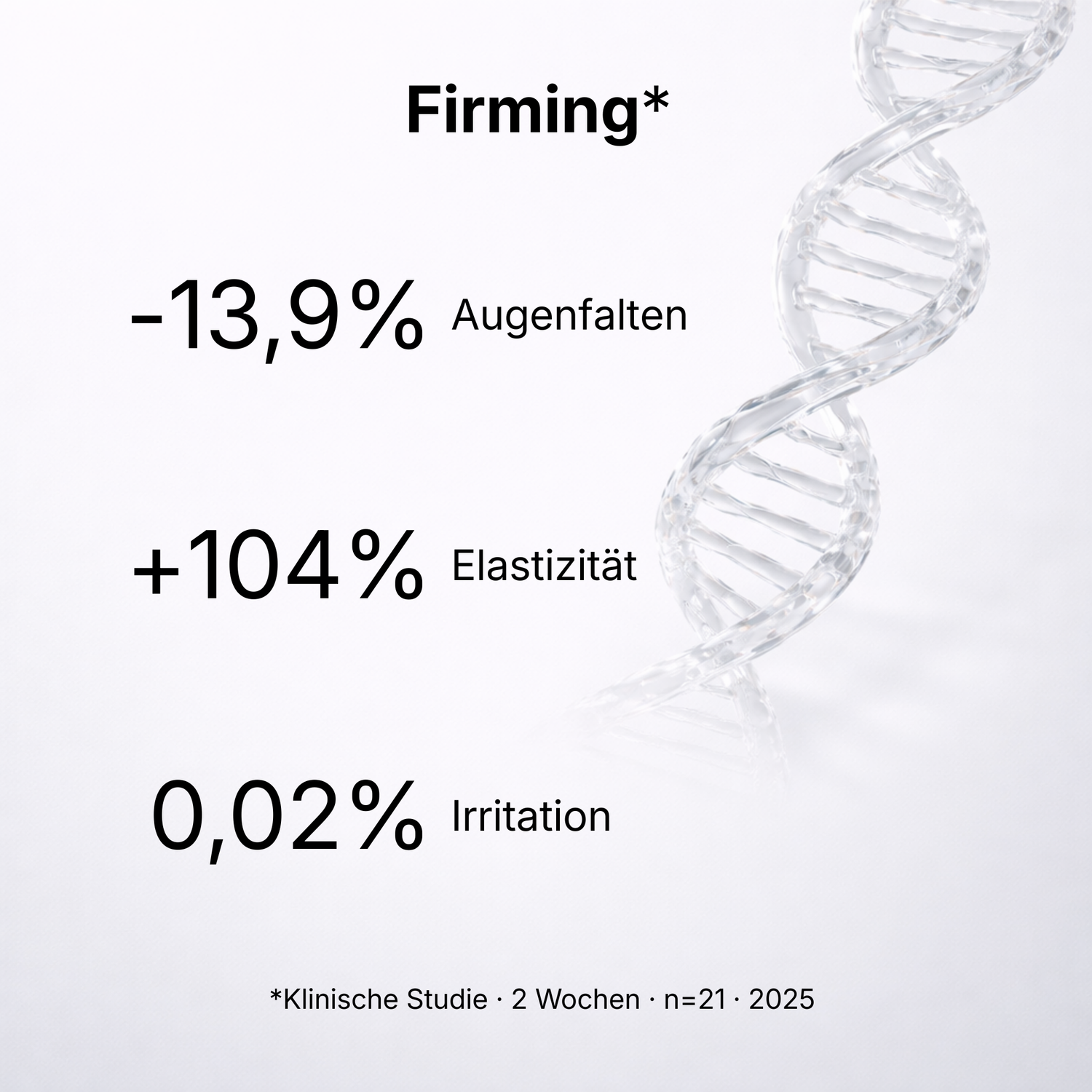 Klinische Testergebnisse zeigen eine Verringerung der Augenfalten um −13,9 % und eine Verbesserung der Hautelastizität um +104 %. Zudem weist die Formulierung eine sehr geringe Irritationsrate von nur 0,02 % auf.